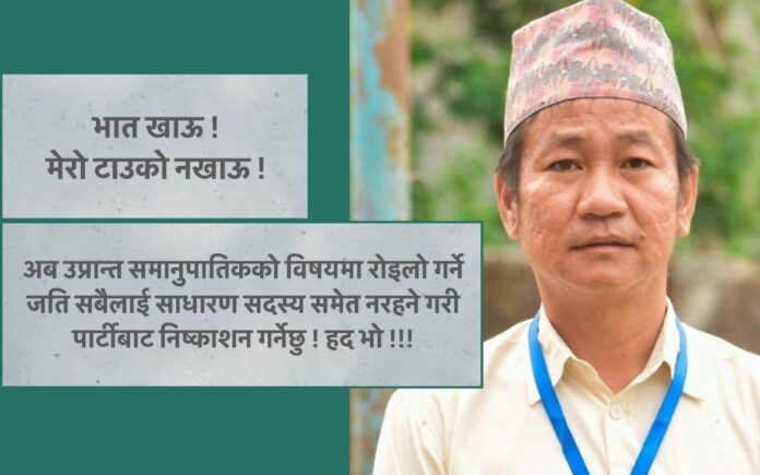 त्यसमा उनले भनेका छन्, ‘अब उप्रान्त समानुपातिकको विषयमा रोइलो गर्ने जति सबैलाई साधारण सदस्य समेत नरहने गरी पार्टीबाट निस्कासन गर्नेछु ! हद भो !!!’