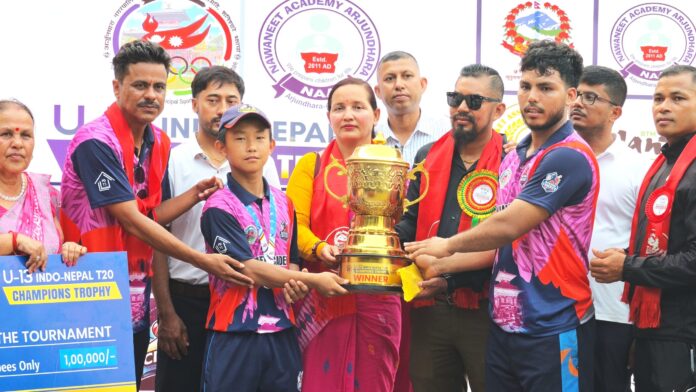 अर्जुनधारा । यू–१३ इन्डो–नेपाल टी–२० च्याम्पियन्स ट्रफीको उपाधि बोस्टन क्रिकेट एकेडेमीले जितेको छ। बोस्टनका कप्तान आनोक राईको विस्फोटक ब्याटिङ र समग्र उत्कृष्ट प्रदर्शनको बलमा अर्जुनधाराको बोस्टनले मेचीनगरको सरस्वती क्रिकेट एकेडेमीलाई ४० रनले पराजित गर्दै उपाधि उचालेको हो।