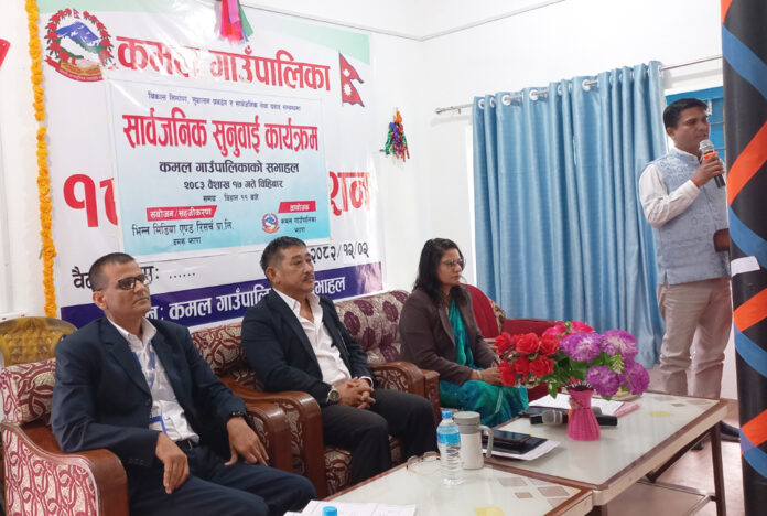 कमल गाउँपालिकाको आयोजना तथा भिन्न मिडिया एण्ड रिसर्च प्रालिको सहजीकरणमा गाउँपालिकाको सभाहलमा कार्यक्रम सम्पन्न भएको हो । स्थानीय सरकारका गतिविधि, सेवा प्रवाह तथा विकास निर्माणका कार्यहरूबारे नागरिकलाई जानकारी गराउने र नागरिकहरूका गुनासा, जिज्ञासा तथा सुझावहरू प्रत्यक्ष रूपमा सुन्नेउद्देश्यले सार्वजनिक सुनवाई कार्यक्रम आयोजना गरिएको हो ।