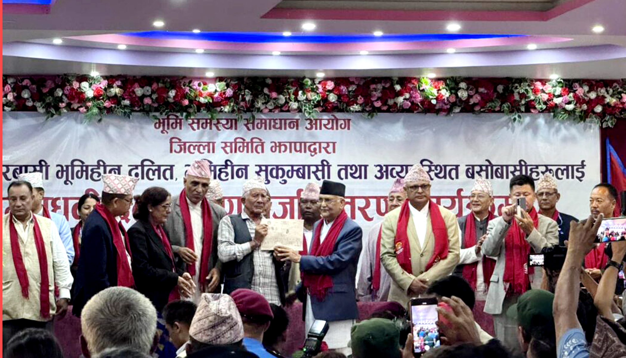 झापा । प्रधानमन्त्री केपी शर्मा ओलीले झापाको कनकाई नगरपालिकामा आयोजित एक विशेष कार्यक्रममा भूमिहीन दलित, सुकुमबासी र अव्यवस्थित बसोबासीहरूलाई जग्गाधनी प्रमाणपत्र (धनीपुर्जा) वितरण गर्नुभएको छ। भूमि समस्या समाधान आयोग, जिल्ला समिति झापाको आयोजनामा सम्पन्न कार्यक्रममा २०० जनालाई उक्त प्रमाणपत्र वितरण गरिएको हो।